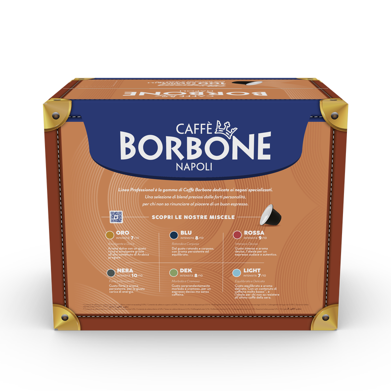 Capsule Borbone compatibili con macchina da caffè Nespresso,  miscela Oro. La massima espressione della tradizione napoletana, miscela dal gusto pieno e persistente. 70% Arabica 30% Robusta